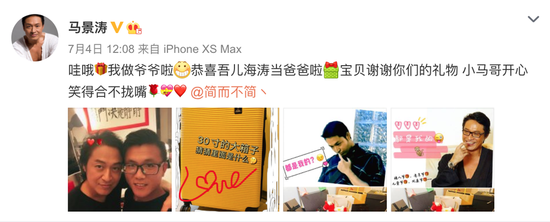 網易娛樂7月5日報道 7月4日,演員馬景濤曬出近況,并配文:“我做爺爺啦,恭喜吾兒海濤當爸爸啦,小馬哥開心笑得合不攏嘴。”