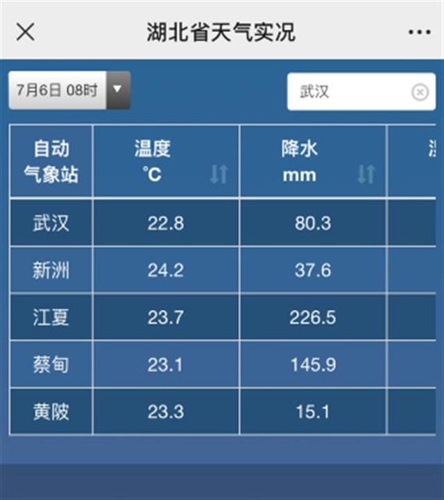 從5個(gè)國家級氣象站來看,強(qiáng)降雨主要在武漢南部:從昨日8點(diǎn)至今日8點(diǎn),東西湖80.3毫米,新洲37.6毫米,江夏226.5毫米,蔡甸145.9毫米,黃陂15.1毫米。
