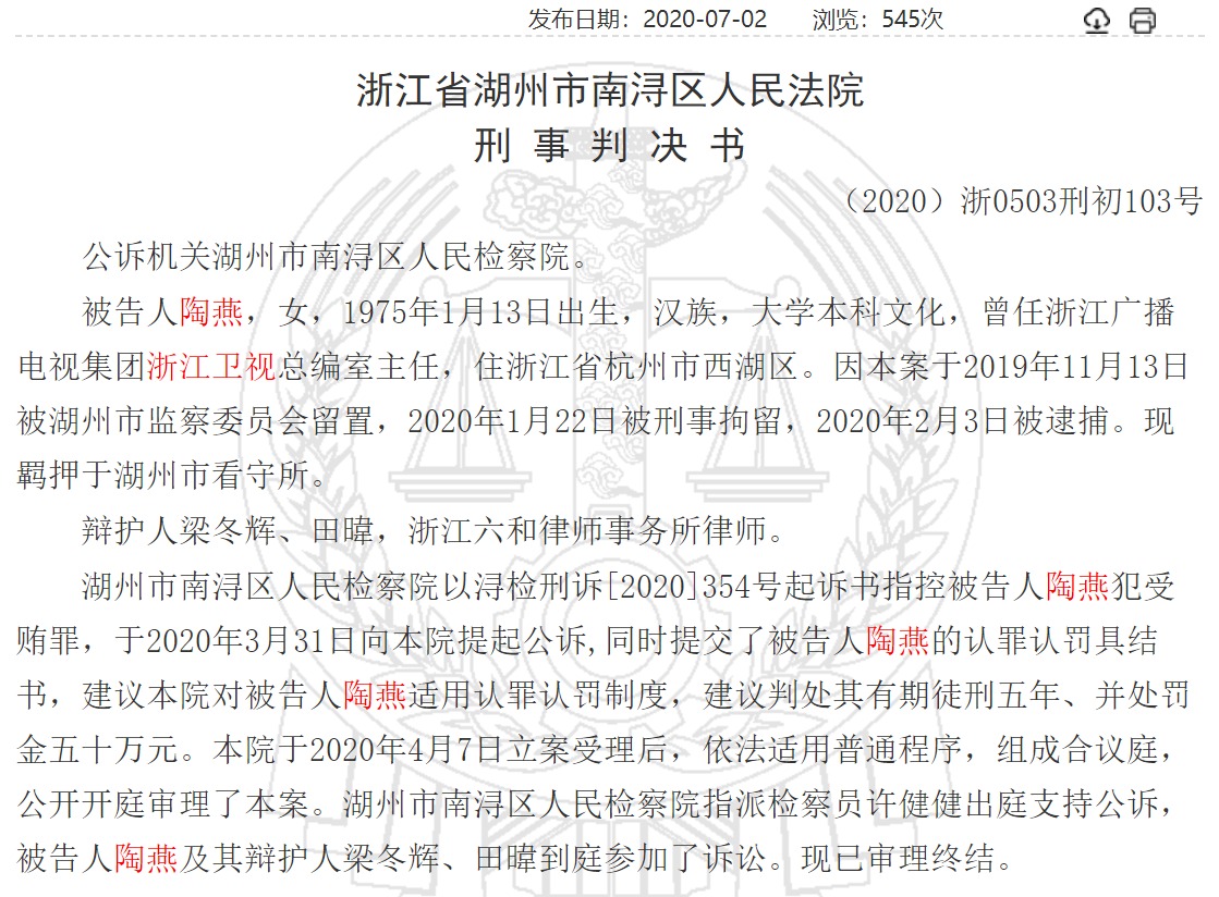 中國裁判文書網《陶燕受賄罪一審刑事判決書》披露的細節顯示,2015年3月至2019年2月期間,被告人陶燕任浙江廣播電視集團浙江衛視總編室主任,負責影視劇購,自制劇制作和版權管理。