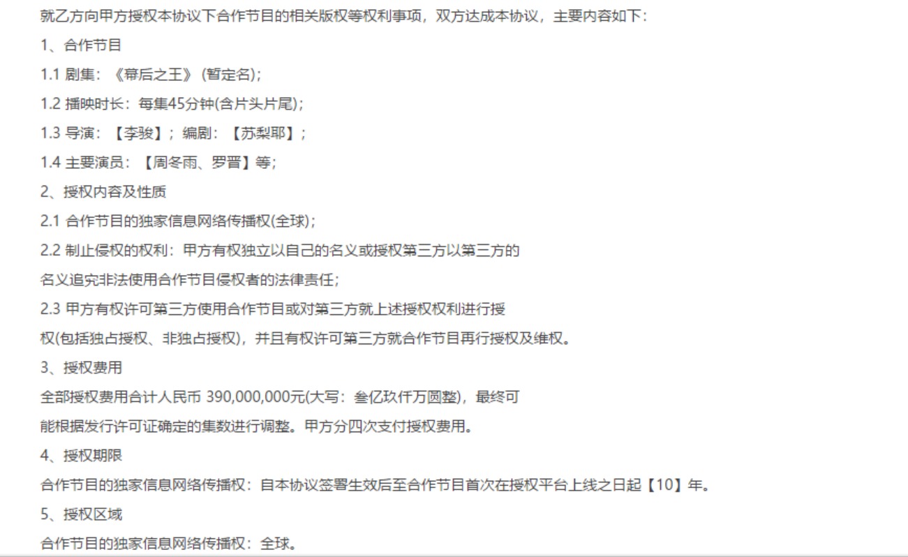 早在2017年,以IP運營為基礎的*ST鼎龍通過子公司浙江夢幻星生園,計劃未來幾年投資拍攝影視作品,其中就包括《幕后之王》。2018年,天貓與夢幻星生園簽訂作品授權協議,授權節目正是周冬雨、羅晉主演的《幕后之王》,全部授權費用合計人民幣3.9億元。