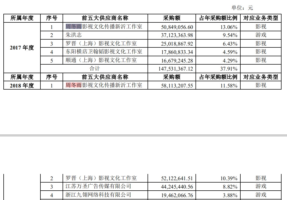 *ST鼎龍在年報回復函中指出,2017年度、2018年度公司前五大供應商中,周冬雨影視文化傳播新沂工作室均位于第一位,兩年采購額累計約1.09億元。羅晉(上海)影視文化工作室也出現在前五大供應商中,2017年、2018年兩年采購額累計約7700萬元。有網友猜測疑似為《幕后之王》相關往來。