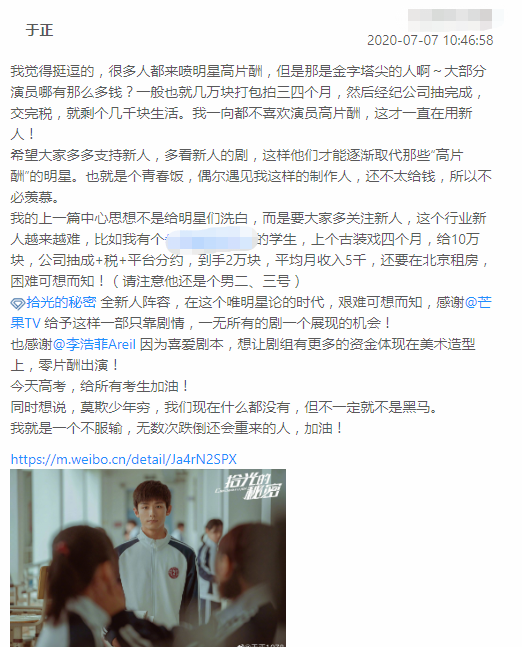 于正還解釋了昨日寫的有關(guān)明星片酬長文的中心思想不是給明星們洗白,而是要大家多關(guān)注新人,“這樣他們才能逐漸取代那些‘高片酬’的明星。也就是個青春飯,偶爾遇見我這樣的制作人,還不太給錢,所以不必羨慕。”