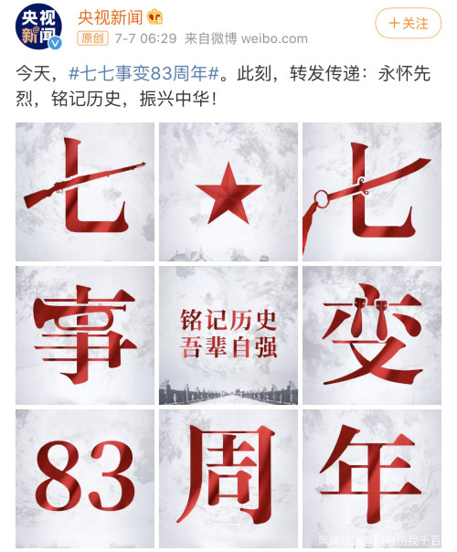 觀察者網(wǎng)7月7日?qǐng)?bào)道 今天(7日)是“七七事變”83周年紀(jì)念日,1937年7月7日盧溝橋畔一聲槍響,拉開(kāi)全民族抗戰(zhàn)的序幕。