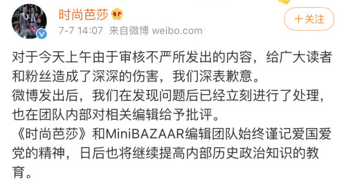 今天下午2點(diǎn)多,@時(shí)尚芭莎 發(fā)文道歉,稱由于審核不嚴(yán)導(dǎo)致錯(cuò)誤。發(fā)現(xiàn)問(wèn)題后團(tuán)隊(duì)已經(jīng)立刻進(jìn)行了處理,也對(duì)相關(guān)編輯給予批評(píng),日后也將繼續(xù)提高內(nèi)部歷史政治知識(shí)的教育。