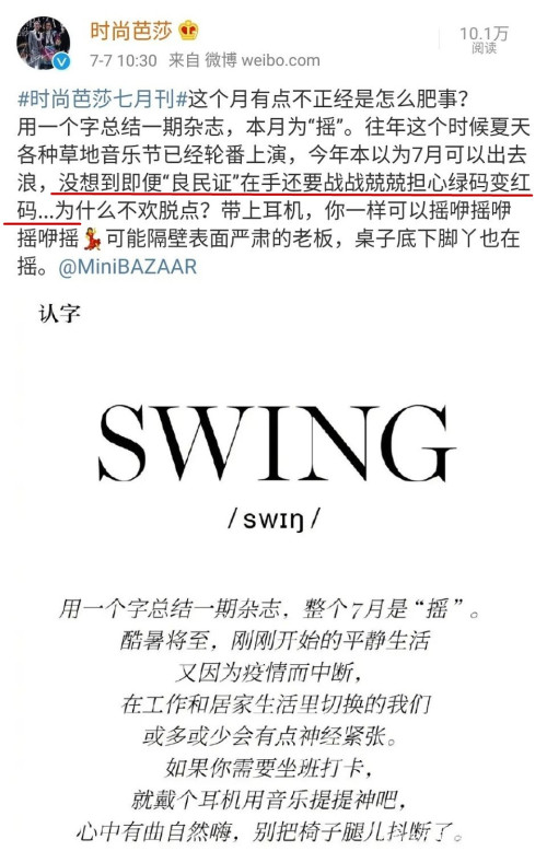 而就在這個(gè)紀(jì)念和致敬先輩不屈抗?fàn)幍娜兆永铮麜r(shí)尚雜志《時(shí)尚芭莎》卻發(fā)了一條極具爭(zhēng)議的博文——將“健康碼”稱為“良民證”。