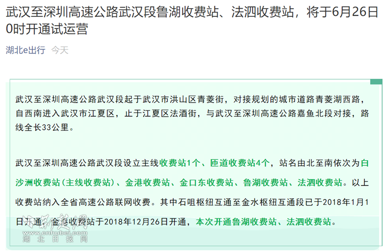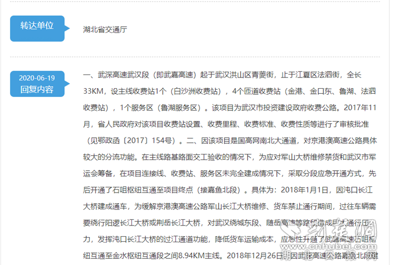 據了解,接到網友留言后,湖北省交通運輸廳于6月19日在《荊楚問政》回復稱,魯湖、法泗收費站將于近期開通,目前正在抓緊開展聯(lián)網收費等收費運營符合性審查驗收,待符合性審查驗收通過后即可開通。