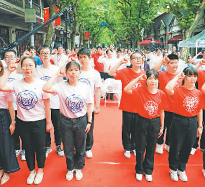 6月29日,上海師生代表在中共一大會址前重溫入黨誓言。新華社記者 劉 穎攝