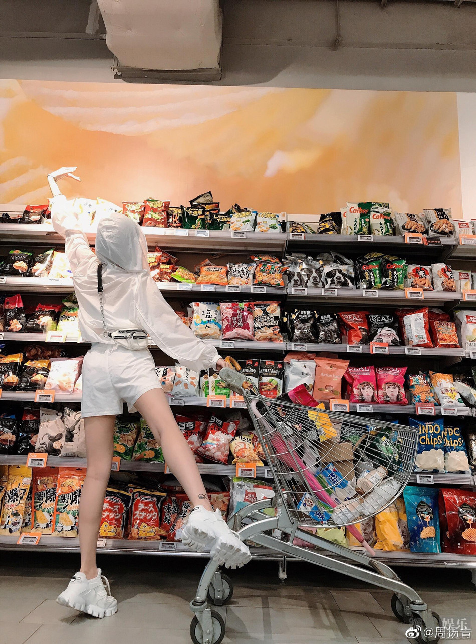 7月7日晚上,周揚青發微博分享去超市的照片,她穿白色套裝擺各種pose超開心,姿勢搞怪一雙長腿十分搶鏡,并喊話為高考學生加油。