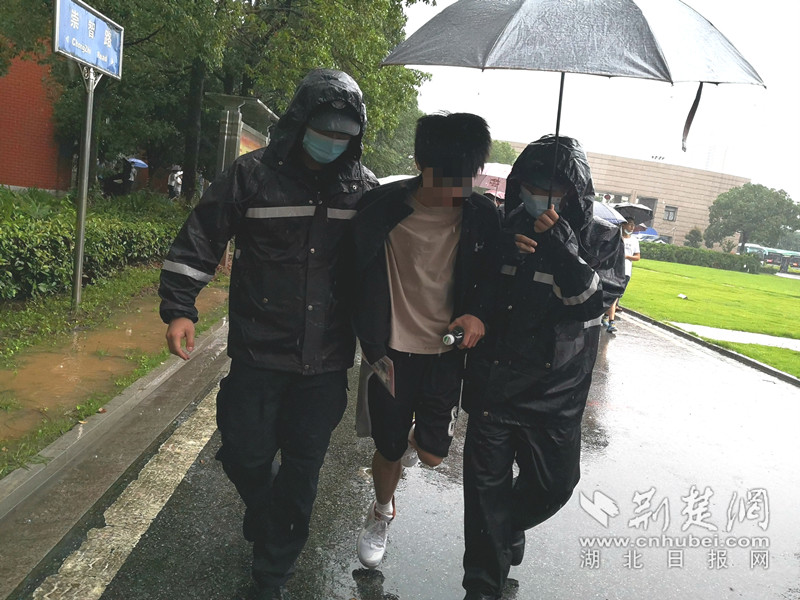 了解情況后,祝勤當即拿起拐杖,將學生從車內(nèi)扶出,尹勝則連忙脫掉已經(jīng)打濕的執(zhí)勤外套,背起該生,一行人冒雨快步從馬路對面跑至校內(nèi)考場,幫助該生準時參加考試。