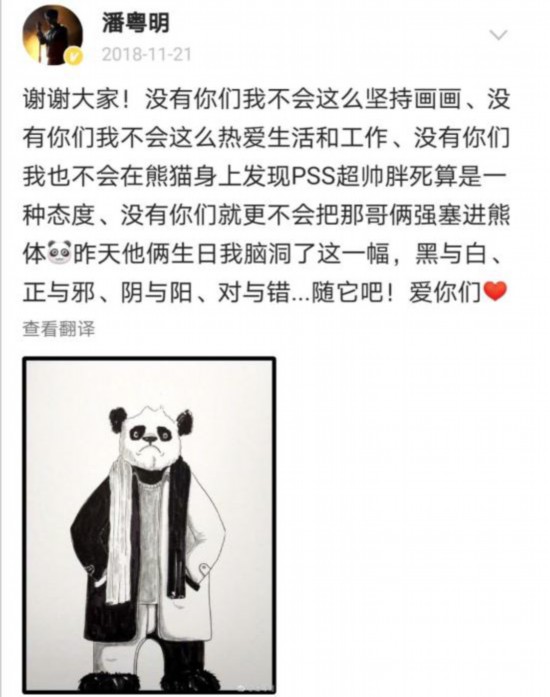 前幾天,潘粵明曬出了拍攝《局中人》時的書桌,拍攝期間,他畫過一張又一張的小畫兒,比如各種姿態的熊貓,漫畫版的定妝照,他曾把這些作品放到微博上,和大家一起“逗悶子”。