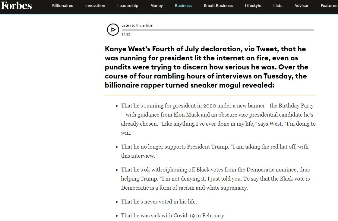 美國說唱歌手坎耶·韋斯特接受《福布斯》雜志采訪