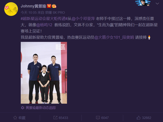 網(wǎng)易娛樂7月9日報道 7月9日上午,黃景瑜在微博曬出參加《超新星運(yùn)動會》與鄧亞萍及男籃運(yùn)動員楊鳴的同框合影,并發(fā)文:“從鄧亞萍老師手中接過這一棒,深感責(zé)任重大,就像楊鳴教練說的,文體不分家,‘生而為贏’的精神我們一起在超新星賽場上見證!” 照片中黃景瑜、楊鳴兩人都身穿深藍(lán)色運(yùn)動服,陽光帥氣。鄧亞萍站在兩人中間,三人組成了M型最萌身高差組合,畫風(fēng)莫名可愛。
