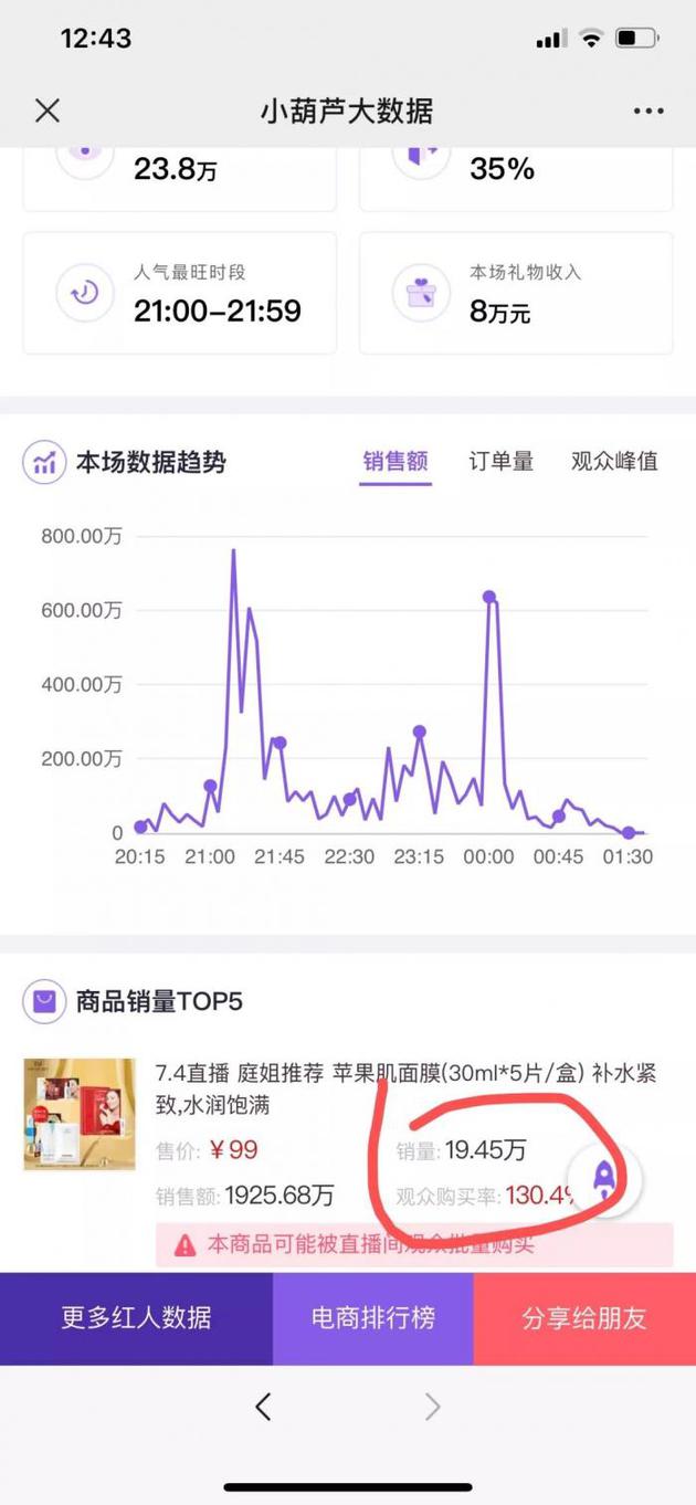 第三方數據平臺小葫蘆大數據監測顯示,藝人張庭在7月4日的一場直播中,其銷售的一款面膜觀眾購買率達到了130.4%。這一數據存在刷單造假的嫌疑,因此被系統外顯提示為“數據異常,本商品可能被直播間觀眾批量購買。”