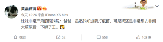 網易娛樂7月9日報道 7月9日,黃磊在微博分享小女兒多妹的趣事,并配文:“妹妹非常嚴肅的跟我說:爸爸,雖然我知道要打疫苗,可是我還是非常想去非洲大草原看一下獅子王…”