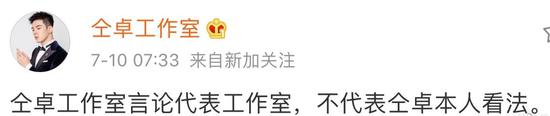網易娛樂7月10日報道 仝卓工作室剛剛再度發文,表示:“仝卓工作室言論代表工作室,不代表仝卓本人看法”。