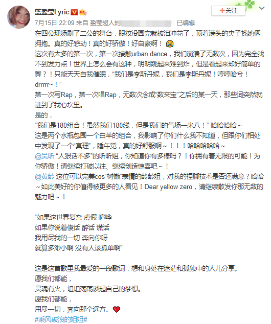 網易娛樂7月16日報道 7月15日,藍盈瑩發長文回憶《乘風破浪的姐姐》第二次公演時和吳昕、黃齡一起并肩作戰的時光,并表白了二人。