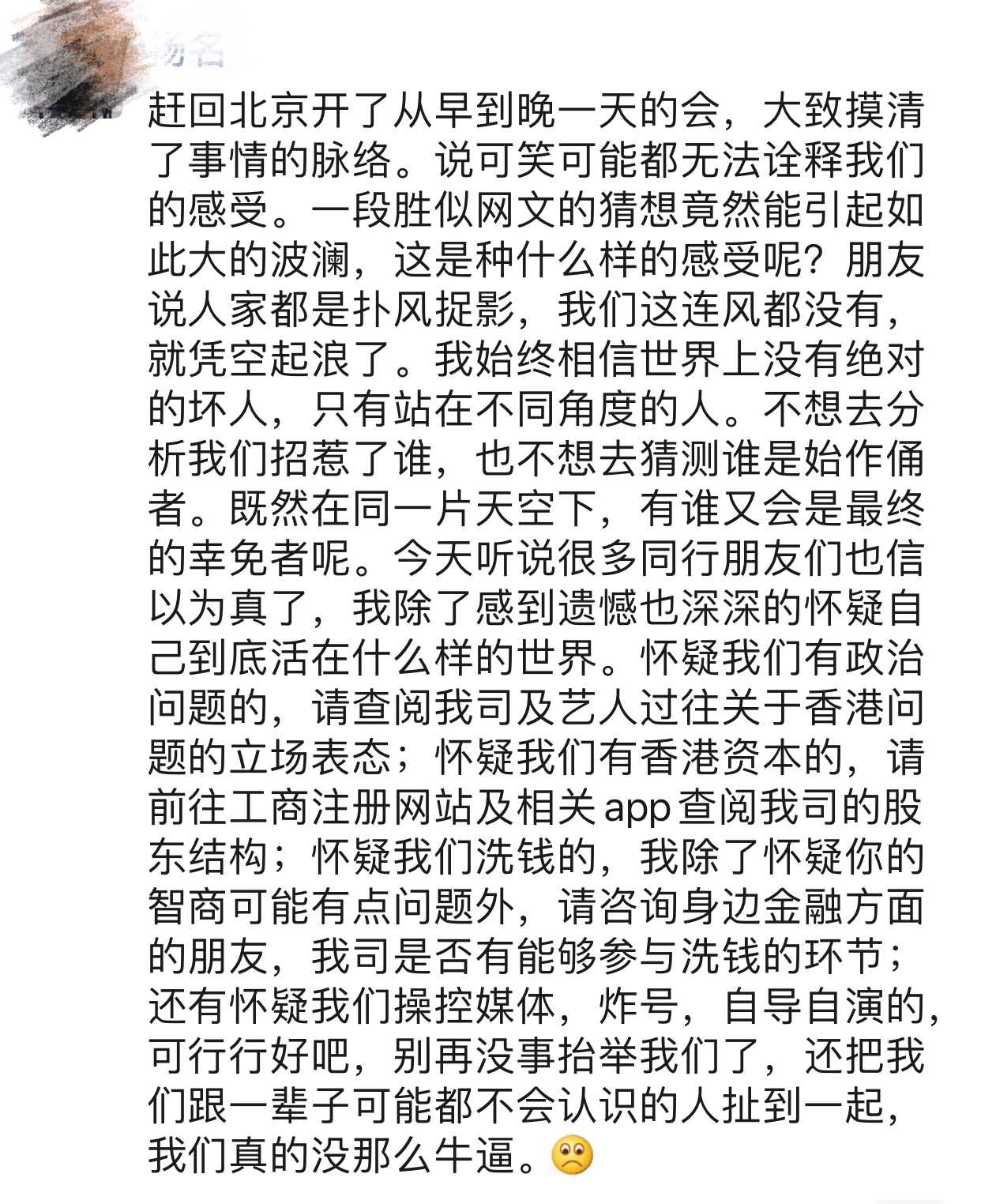 “趕回北京開了從早到晚一天的會,大致摸清了事情的脈絡(luò)。說可笑可能都無法詮釋我們的感受。一段勝似網(wǎng)文的猜想竟然能引起如此大的波瀾,這是種什么樣的感受呢?朋友說人家都是撲風(fēng)捉影,我們這連風(fēng)都沒有,就憑空起浪了。我始終相信世界上沒有絕對的壞人,只有站在不同角度的人。不想去分析我們招惹了誰,也不想去猜測誰是始作俑者。既然在同一片天空下,有誰又會是最終的幸免者呢。今天聽說很多同行朋友們也信以為真了,我除了感到遺憾也深深的懷疑自己到底活在什么樣的世界。懷疑我們有政治問題的,請查閱我司及藝人過往關(guān)于香港問題的立場表態(tài);懷疑我們有香港資本的,請前往工商注冊網(wǎng)站及相關(guān)app查閱我司的股東結(jié)構(gòu);懷疑我們洗錢的,我除了懷疑你的智商可能有點(diǎn)問題外,請咨詢身邊金融方面的朋友,我司是否有能夠參與洗錢的環(huán)節(jié);還有懷疑我們操控媒體,炸號,自導(dǎo)自演的,可行行好吧,別再沒事抬舉我們了,還把我們跟一輩子可能都不會認(rèn)識的人扯到一起,我們真的沒那么牛逼。