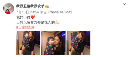 7月15日,張子萱在小號曬出抱著女兒安安的照片,并感嘆“當媽以后臂力都是驚人的”。照片中,張子萱身穿黑色緊身長袖,長發披肩,眼睛大大少女感十足;安安則穿著花裙子,梳高馬尾,臉蛋肉乎乎很可愛。