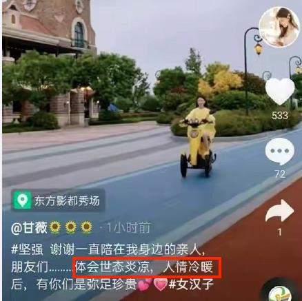 據悉,甘薇因一筆5.3億元的欠款,被上海法院限制出境,這也是她對丈夫賈躍亭的銀行貸款所承擔的連帶責任。這條消息曝光,她曾發視頻稱體會到世態炎涼,人情冷暖。