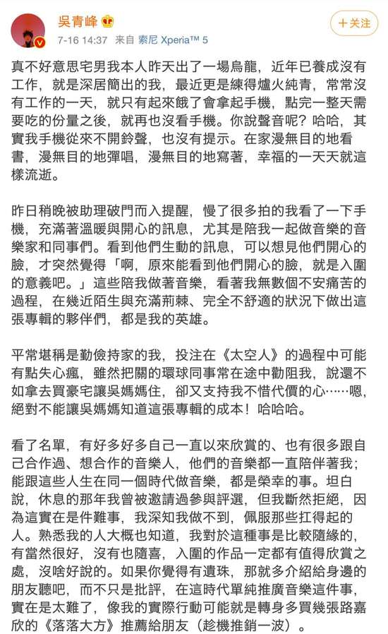網(wǎng)易娛樂7月16日報(bào)道 7月16日,在金曲獎(jiǎng)公開入圍名單一天后,喜提四項(xiàng)大獎(jiǎng)的吳青峰發(fā)長文談感受。他表示自己沒有工作的時(shí)候就喜歡宅在家里,點(diǎn)完一天需要吃的外賣后就再也沒有看手機(jī),所以直到助理破門而入提醒自己,自己才想起來看手機(jī),看到手機(jī)里面一條條溫暖的訊息,吳青峰說:“啊,原來能看到他們開心的臉,就是入圍的意義吧。”隨后,吳青峰分享了自己制作《太空人》這張專輯的努力和心血,他也對同樣入圍的歌手音樂人表示祝賀。最后他表達(dá)了對于這張專輯付出的所有人的感謝:“今年是我十幾年來第一次好認(rèn)真寫感想,一封封訊息讓我想起一張張《航天員》之旅中,陪我笑著哭著,真心感動(dòng)著的臉龐,可以因?yàn)樽约旱囊稽c(diǎn)小事,而換來他們的開心,是我的大幸福,我感謝我有感受這份幸福的機(jī)會(huì)。”還附上了一張自己頂著雞窩頭,揉著眼睛睡不醒的自拍。