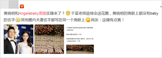 黃曉明與楊穎已多次被傳離婚。老藝術家于藍逝世時,其他明星夫婦送的挽聯都是寫上夫婦二人的名字,然而黃曉明送的挽聯上卻只有他自己的名字,并沒有將楊穎的名字列上,引發熱議,二人婚姻出狀況甚至有可能離婚的傳言再次掀起。不過,目前黃曉明和楊穎并未公開正式對這些傳言進行回應,也沒有曬合體同框照秀恩愛來否認。