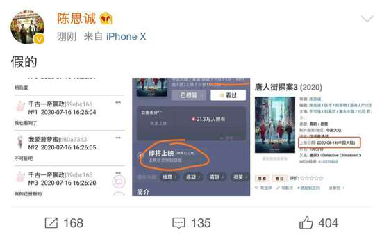 網易娛樂7月16日報道 7月16日,在國家電影局通知20日開始開放低風險地區電影院后,網上傳出《唐探3》定檔8月14日上映的消息。隨后,陳思誠發文辟謠:“假的”。