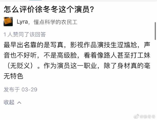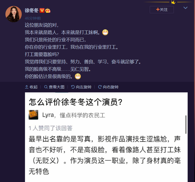 網(wǎng)易娛樂(lè)7月17日?qǐng)?bào)道 日前,有網(wǎng)友評(píng)價(jià)徐冬冬“不是高級(jí)臉,看著像路人甚至打工妹”,7月17日,徐冬冬直接硬核回懟:“我本來(lái)就是路人,本來(lái)就是打工妹啊……我的臉高級(jí)不高級(jí)……見仁見智,你的臉估計(jì)是很高級(jí)的”,“大嫂”真的太剛了,引來(lái)網(wǎng)友一片支持:“冬冬姐你在我心目中永遠(yuǎn)都是最棒的存在啊!”,“相信你一定會(huì)獲“。”得成功的呀!”