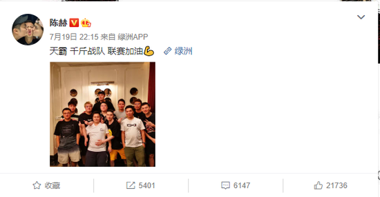 網(wǎng)易娛樂7月20日報道 陳赫在綠洲曬出與電子競技戰(zhàn)隊天霸隊成員的合影,并祝戰(zhàn)隊聯(lián)賽加油,他寫道:“天霸,千斤戰(zhàn)隊,聯(lián)賽加油?!闭掌?,陳赫站在成員們的身后,與成員們一起合影留念。