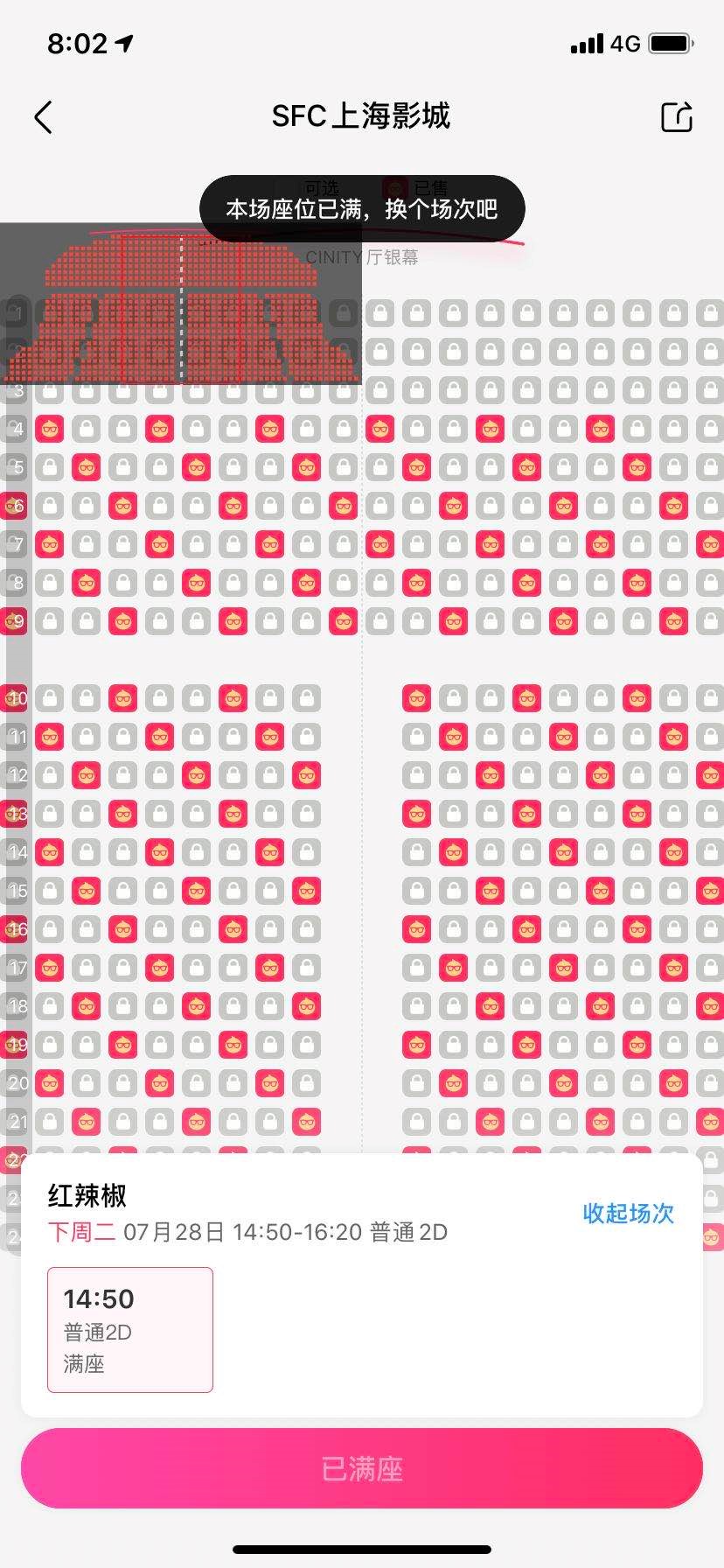 早晨8點準時開票的淘票票購票系統顯示的座位已經自動鎖定相隔了2~3個位置為一個可選座位,因此想要搶到心儀的電影票更是一件來之不易的事情。甫一開票,許多熱門場次就“全線飄紅”,《紅辣椒》《千年女優》《八部半》《現代啟示錄》等熱門影片基本上都是“秒光”。