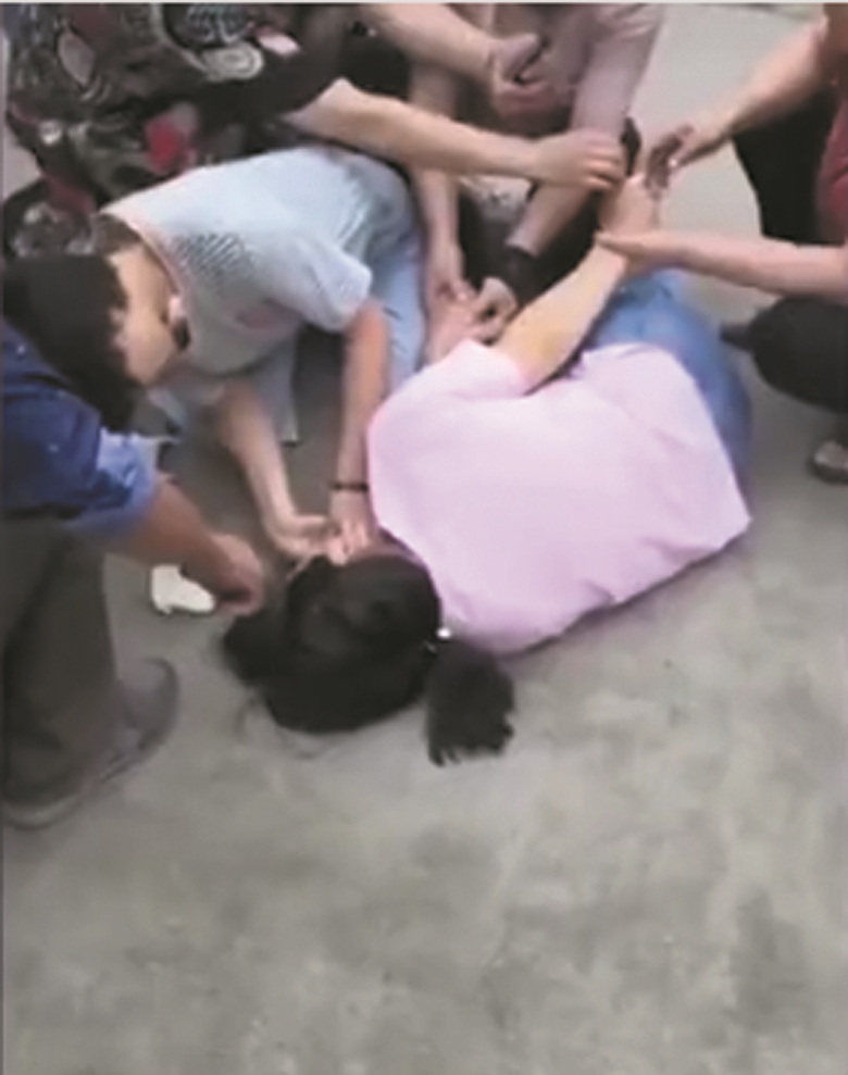 事發淮安市洪澤區人民路。在網友拍攝的視頻中,一名身穿粉色上衣、淺藍色牛仔褲的女孩倒在地上,整個身體蜷縮在一起。孫芳雙膝跪在女孩身邊俯身施救,其脖子上的術后紗布依稀可見。