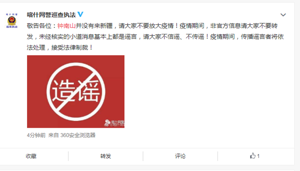 “鐘南山來(lái)新疆了”是一則謠言。剛剛,“@喀什網(wǎng)警巡查執(zhí)法”辟謠:鐘南山并沒(méi)有來(lái)新疆,請(qǐng)大家不要放大疫情。請(qǐng)大家不要轉(zhuǎn)發(fā)非官方信息,不信謠、不傳謠!