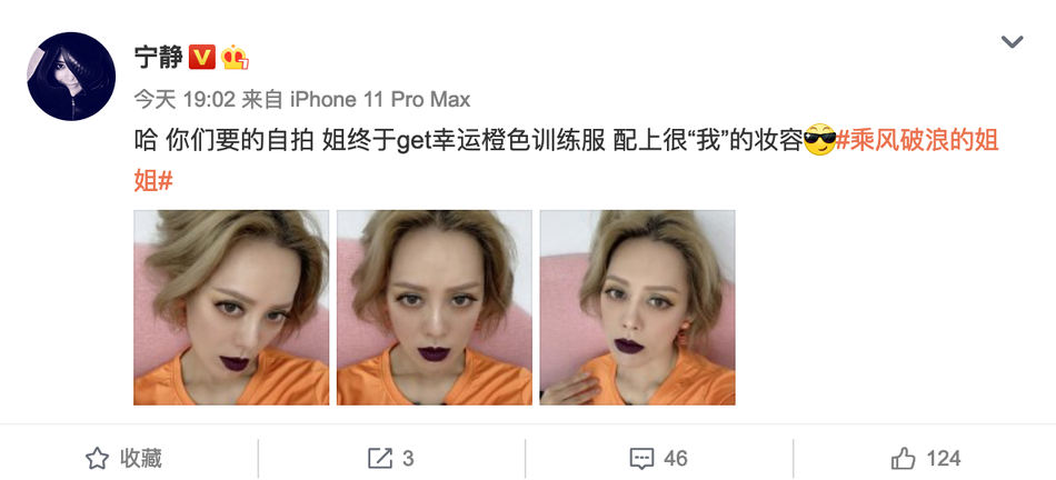 7月20日,寧靜在微博曬自拍照,并配文:“你們要的自拍,姐終于get幸運橙色訓練服,配上很‘我’的妝容。”照片中,寧靜身穿橙色訓練服,嘴上涂著深紫色口紅,看上去十分有氣場。