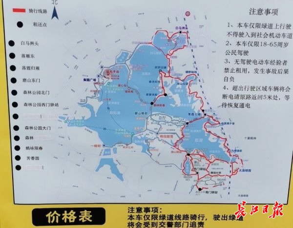 記者注意到,景區(qū)租還點的指示牌上也清楚注明:“本車僅限綠道線路騎行,駛出綠道將會受到交管部門追責。”2019年7月,在三鎮(zhèn)街頭,武漢交警曾開展執(zhí)法,暫扣無牌、不符合非機動車新國標參數(shù)的共享電動車2200多輛。