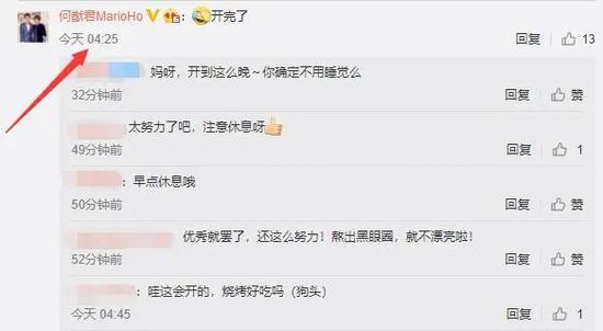 直到凌晨4點多,何猷君才出現在老婆的這條“吐槽”動態(tài)下,留下評論稱自己已經開完會了,網友們紛紛夸贊何猷君非常努力。