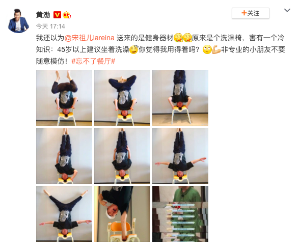 27日,黃渤在微博曬出宋祖兒送自己的洗澡椅,竟誤當健身器材練習起花式倒立、還有單手倒立。隨后卻遭宋祖兒在評論區無情拆穿“倒立”真相!此前在忘不了餐廳節目中,專家說45歲以上就要坐著洗澡,貼心的祖兒因此為黃渤送上“大禮”。