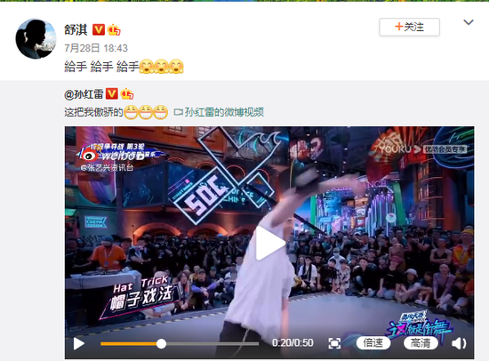 網(wǎng)易娛樂7月29日報道 日前,孫紅雷分享張藝興在《這就是街舞》的跳舞視頻,寫道“這把我傲驕的”,舒淇隨后轉(zhuǎn)發(fā),表示“給手,給手,給手”,還配上了可愛的小表情。隨后,張藝興回復(fù)舒淇,“姐專業(yè)啊”。