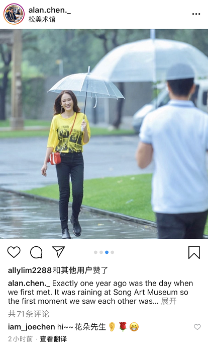 網易娛樂7月29日報道 7月29日,艾倫在社交平臺發文并定位在松美術館,發文稱:“一年前的今天我們見面,那天下雨,我們撐著傘在松美術館第一次相見,一年過去了這個世界有很多變化包含病毒,我們祝愿每個人身體強壯!我會永遠愛你,喬恩。”隨后,陳喬恩留言評論:“hi,花朵先生。”