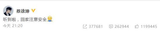 網易娛樂7月30日報道 7月29日,《奔跑吧》節目殺青,蔡徐坤粉絲在現場大喊“生日快樂”,為他提早慶祝生日。晚間,蔡徐坤在微博發文回應粉絲:“聽到了,回家注意安全。”