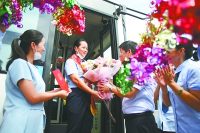 武漢晚報訊 “祝賀秀麗,你當之無愧!我們所有人都為你感到驕傲、自豪……”7月29日10時許,黃陂奧萊西街公交場站,武漢公交290路43歲司機趙秀麗駕駛1538號車到站停車剛一下車,早已在此等候的同事們當即揮舞著彩帶一擁而上,為她送上了一捧鮮花以及代領的“武漢五一勞動獎章”證書、獎牌等,并為她佩戴上了綬帶。