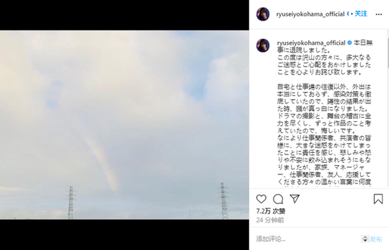 網易娛樂7月30日報道 7月30日,橫濱流星在社交網站上發文表示今天已經順利出院,他在文中表述,自己除了往返自家和工作地點都沒有外出,預防工作也做得很徹底,當被告知感染新冠病毒后腦子一片空白,非常感謝醫務人員的救治,并向共演者和工作人員帶來了極大困擾表示道歉。