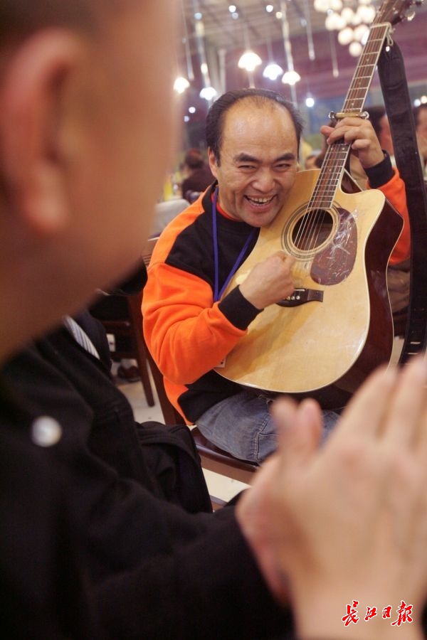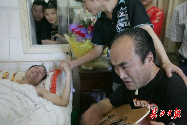 2007年6月3日,在湖北省腫瘤醫院,呂文禮先生帶領吉慶街的一群藝人為重病中的另一位“四大天王”“拉茲”(一個月后去世)演奏吉他音樂,鼓勵他戰勝病魔。記者金思柳 攝