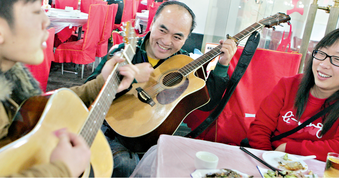 2007年11月2日,“老通城”呂文禮(中)和他的兒子(左一)一起在吉慶街為食客表演吉他彈唱。