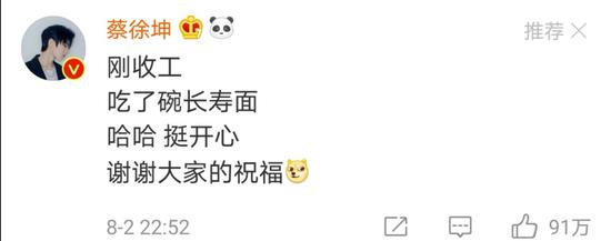 網易娛樂8月3日報道 8月2日晚,蔡徐坤發文感謝大家的生日祝福,他表示:“剛收工,吃了碗長壽面,哈哈,挺開心,謝謝大家的祝福?!?/p>