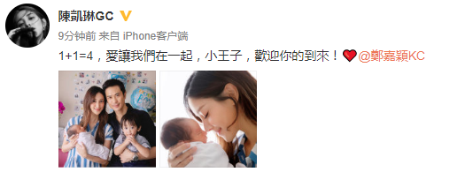 隨后,陳凱琳也曬出合照并發文表示:“1+1=4,愛讓我們在一起,小王子,歡迎你的到來!”