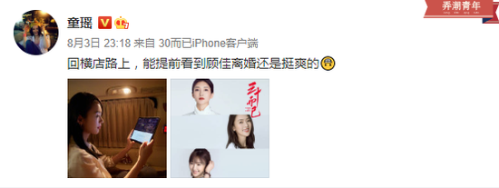 網(wǎng)易娛樂8月4日?qǐng)?bào)道 8月3日,電視劇《三十而已》大結(jié)局超前點(diǎn)播,童瑤在社交平臺(tái)曬出追劇的照片并寫道:“回橫店路上,能提前看到顧佳離婚還是挺爽的”。
