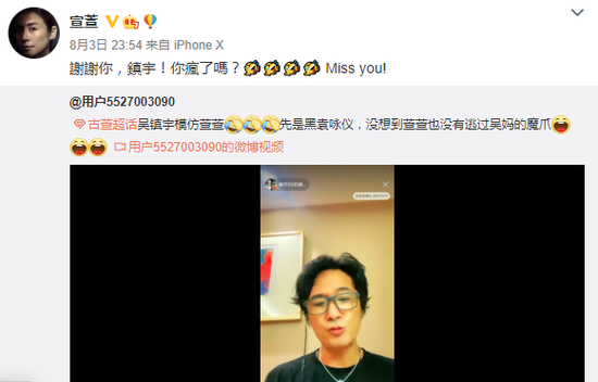 網(wǎng)易娛樂8月4日報道 近日,吳鎮(zhèn)宇在直播中模仿起了宣萱,沒想到炸出本尊,8月3日晚,宣萱在社交平臺轉發(fā)視頻并回應道:“謝謝你,鎮(zhèn)宇!你瘋了嗎?Miss you!”