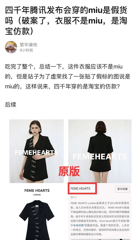 據悉,鞠婧祎8月2日參加發布會時穿了一件黑色連衣裙,采用的是蝴蝶結露腰設計。鞠婧祎同款博發文稱鞠婧祎所穿連衣裙來自MiuMiu,直接艾特了品牌方官博,曬出的同款也是采用的MiuMiu官方的照片。但經過網友調查發現MiuMiu家原版并沒有露腰設計,反倒是淘寶的山寨品均是露腰款,并且山寨品在鞠婧祎出席活動前已在淘寶販售。