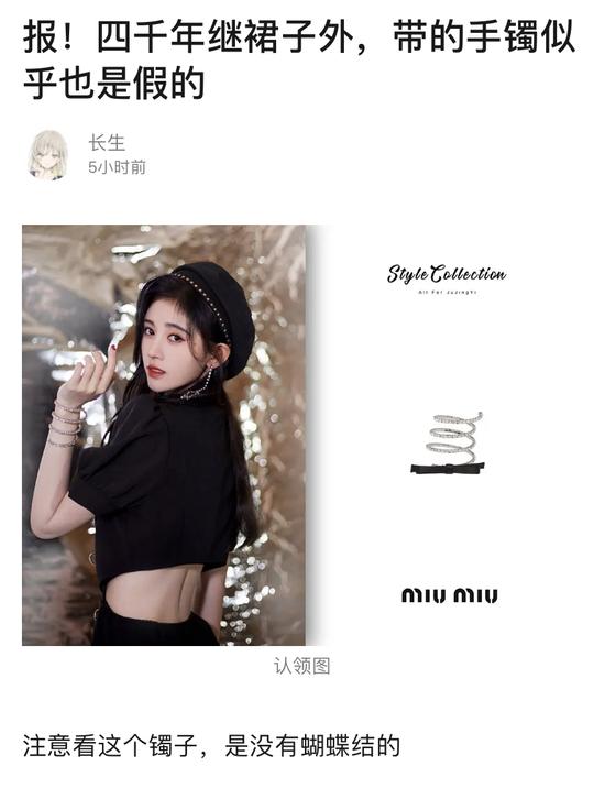 同時,還有人發現鞠婧祎戴的手鐲也跟miumiu官網的圖有出入,一個有蝴蝶結,一個沒有。
