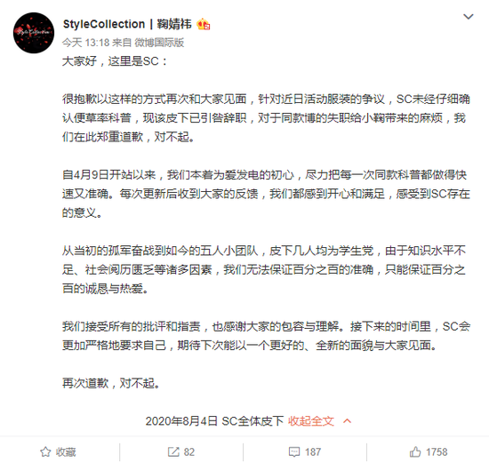 目前,曾發文指路MiuMiu官博的鞠婧祎同款博已發文致歉,稱站子是五人小團隊,且成員均為學生黨,并非官方團隊,檢索同款并發布僅憑熱愛,愿意接受所有批評和指責,涉事成員已引咎辭職。同款博的聲明變相承認了鞠婧祎所穿服飾并非來自MiuMiu。