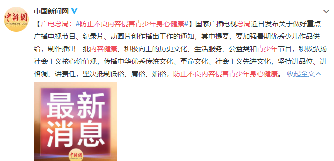 其中提要,要加強暑期優秀少兒作品供給,制作播出一批內容健康、積極向上的歷史文化、生活服務、公益類和青少年節目,積極弘揚社會主義核心價值觀,傳播中華優秀傳統文化、革命文化、社會主義先進文化,堅持講品位、講格調、講責任,堅決抵制低俗、庸俗、媚俗,防止不良內容侵害青少年身心健康。